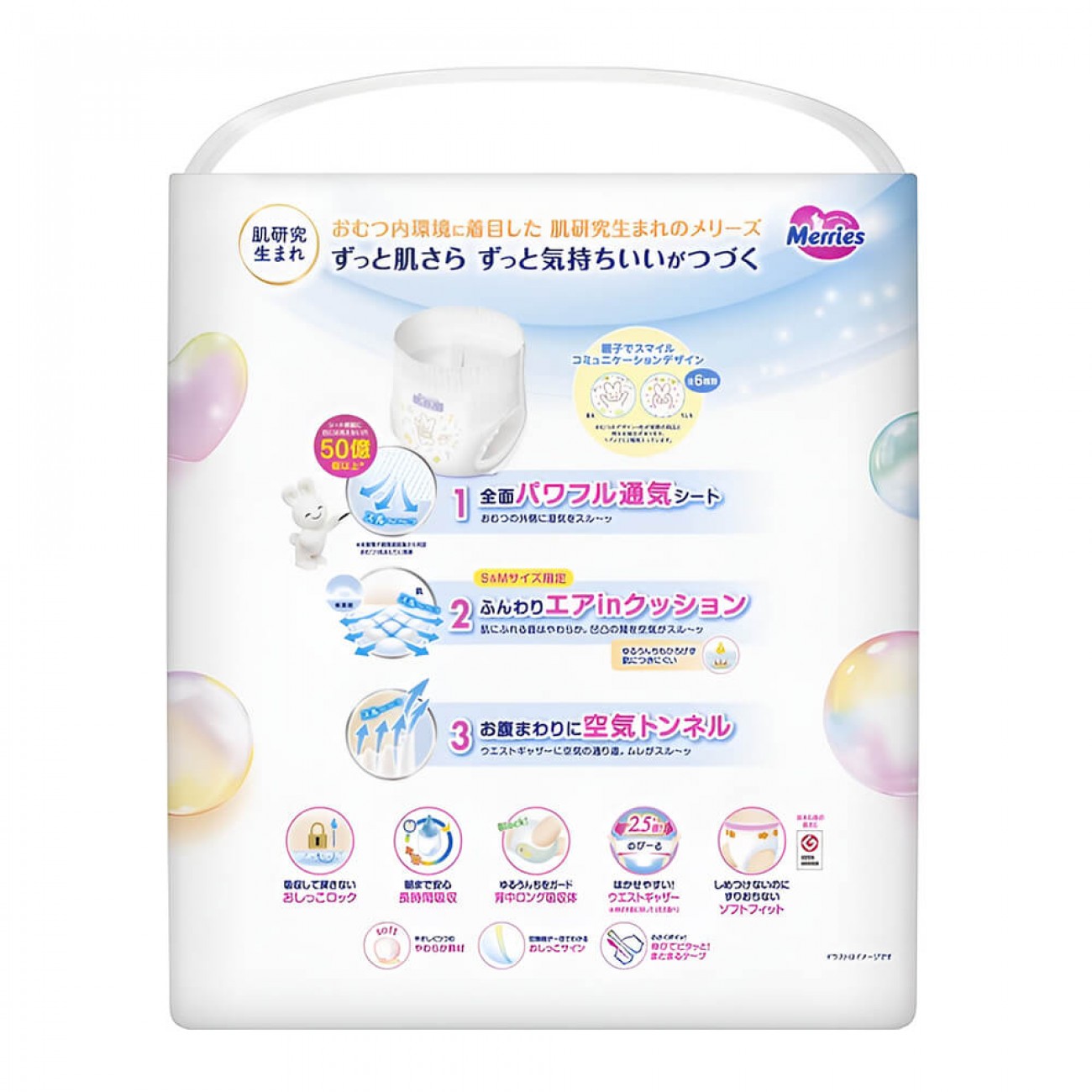 Опис Підгузки-трусики Merries SJ, розмір S, 4-8 кг 62 шт (4901301425867)