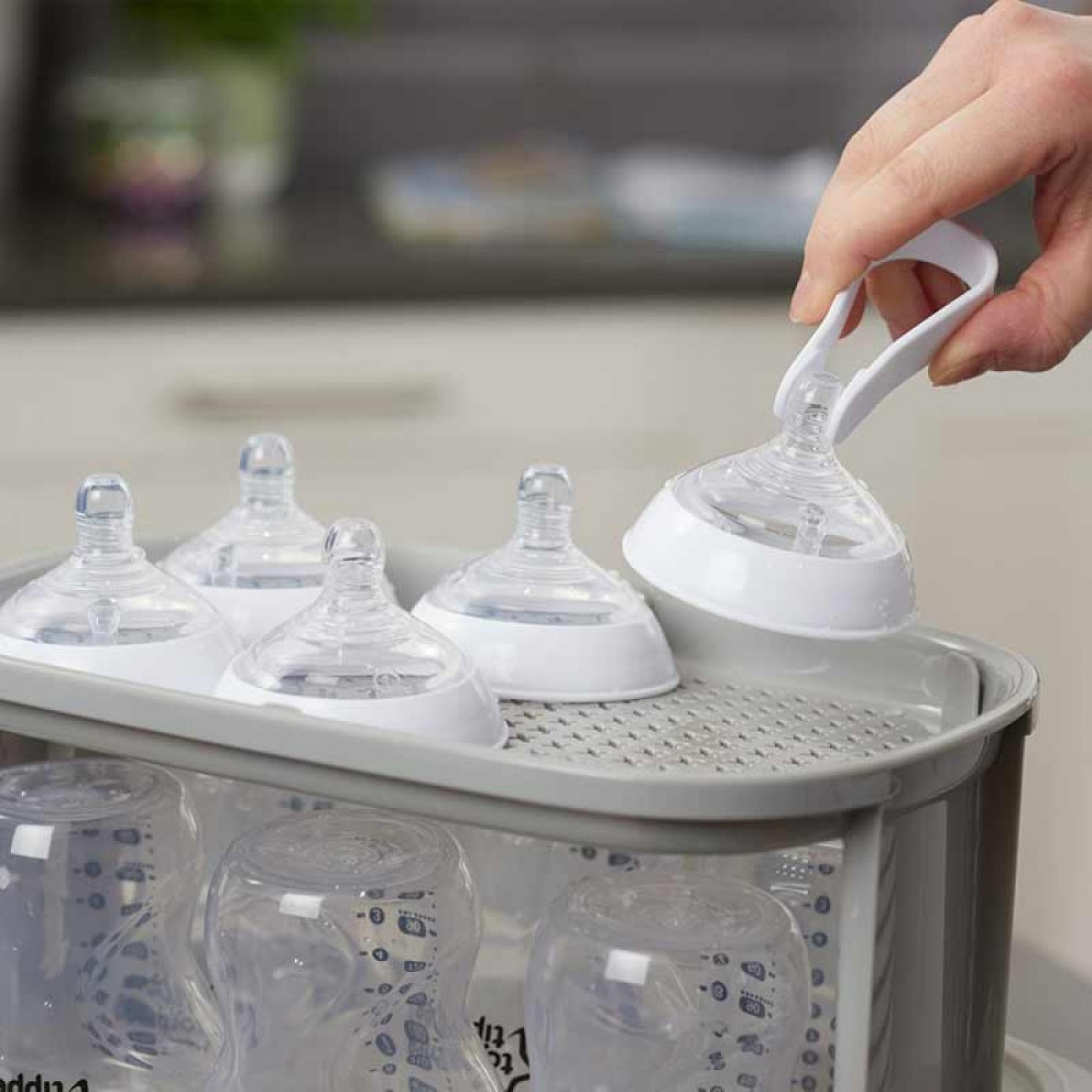 Бічні ручки на кришці стерилізатора допомагають трохи підняти її і захищають руки від пари. Дворівневий лоток також можна використовувати як сушарку. Запуски циклу стерилізації здійснюється простим натисканням на одну кнопку. З метою безпеки в електричному стерилізаторі Tommee Tippee передбачено автоматичне відключення після кожного циклу стерилізації.