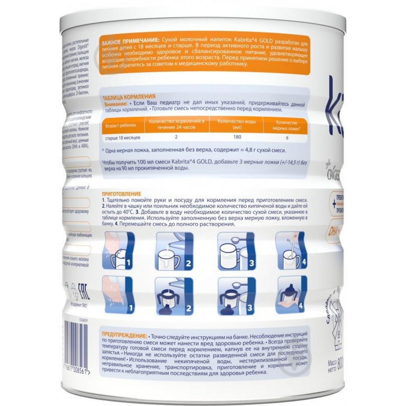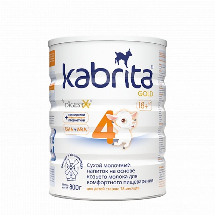 -Суміш Kabrita 4 GOLD виробляється з корисного козячого молока з додаванням найцінніших сироваткових білків козячого молока, комплексу DigestX, пребіотиків (ФОС, ГОС), пробіотиків (біфідобактерії Bifidobacterium BB-12), DHA і ARA, нуклеотидів.