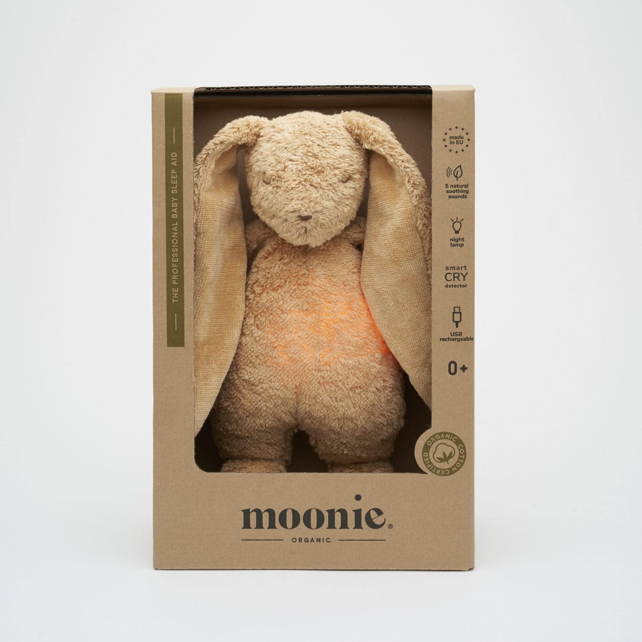 Співаючий Зайчик MOONIE ORGANIC - це професійний помічник у вкладанні малюків спати, виготовлений із сертифікованої органічної бавовни. Завдяки безпечному природному рожевому шуму дозволяє дітям швидше заспокоїтися і заснути. І це ще не все! MOONIE також є нічником, який може світитися 7 різними кольорами, має датчик плачу та перезаряджається через USB. Красиво упакований, ідеальний на подарунок.